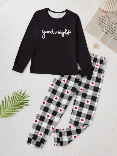 晚安图案和心形格子图案可爱休闲女孩睡衣套装、长袖上衣和裤子 - 黑與白 - 查看 1