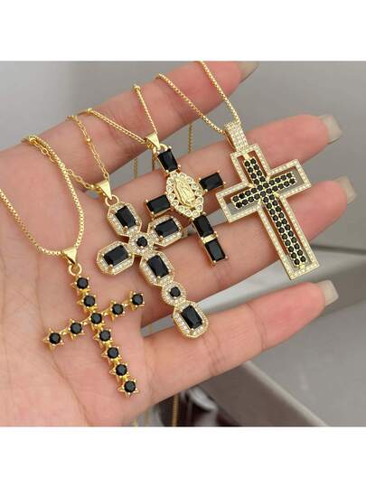哥特朋克风格黑色十字架吊坠项链,镀铜 CZ,女士个性化宗教珠宝,适合日常佩戴/节日礼物 - 金色 - 查看 1