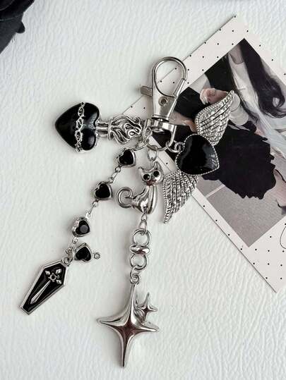 哥特风心形翅膀钥匙扣,手机耳机包挂饰,可爱猫咪钥匙圈