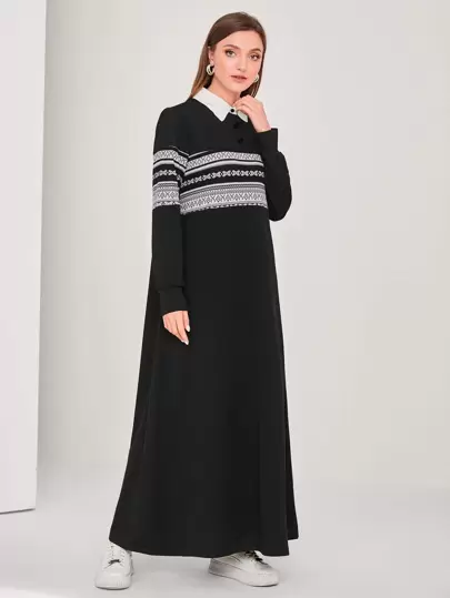 Graceveil 几何印花高领 T 恤 端庄长袖连衣裙 - 黑色 - 查看 1