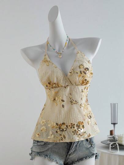 Zolique 浪漫闪亮蓝色亮片吊带背心,适合夏日海滩度假 - 杏色 - 查看 5