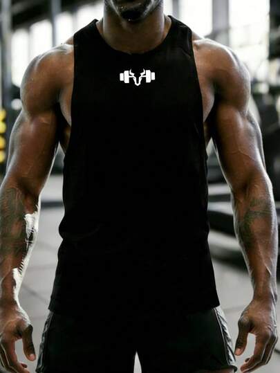 GymBeat 男士杠铃印花圆领休闲健身运动背心 - 黑色 - 查看 1