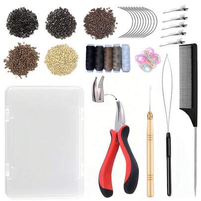 接发工具套装,500颗硅胶内衬微珠,1把钳子,1个穿线器,1个钩针,10个弯发夹,5个发卡,5卷缝纫线,1包橡皮筋和1个收纳盒,初学者接发入门套装。 - 查看 1