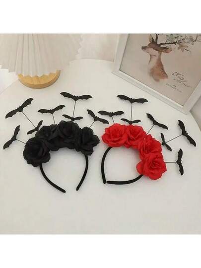 万圣节可爱女巫帽,配有红色和黑色仿花,哥特式蝙蝠发夹头带,创意花朵和蝙蝠头饰,适合节日派对服装装饰 - 彩色 - 查看 1
