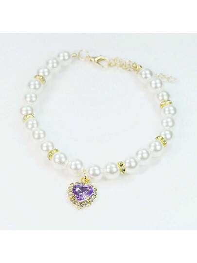 心形水晶吊坠和珍珠装饰宠物项链适合中小型宠物 - 紫色 - 查看 1