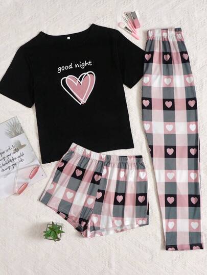 心形和口号图案 T 恤和格子印花短裤和长裤 睡衣套装 / 睡衣套装 - 彩色 - 查看 1