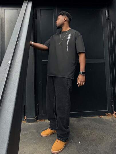 Heavens Edit 男式宽松卡其色圆领 T 恤,带有日本刀鞘设计,春夏 - 黑色 - 查看 6
