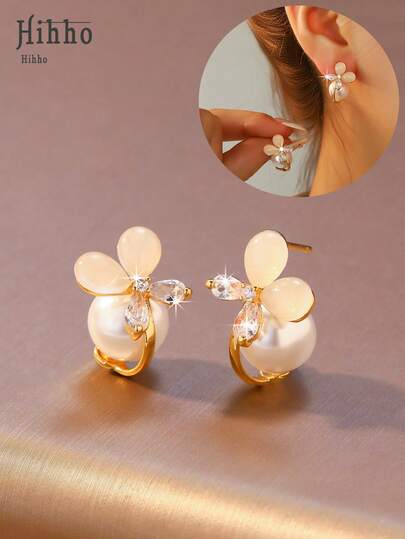 Hihho 一对花朵珍珠锆石耳钉,搭配猫眼石吊坠,柔美空灵,通勤风格