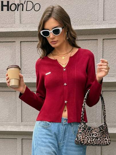 Hon'Do 2026 春季嘉年华时尚女式海星纽扣针织上衣,V 领收腰,中等弹力面料 - 酒紅色 - 查看 1