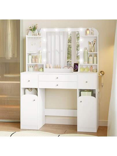 Hzuaneri Dressing Table With Mirror, Vanity Table With Adjustable Brightness, Power Strip, 4 Drawers And 2 Open Cabinets, 5 Jewelry Hooks, Open Compartments, White - 白色 - 查看 1