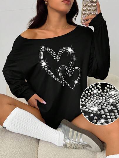 INAWLY 心形钻石图案露肩长袖休闲图案 T 恤女式上衣 - 黑色 - 查看 1