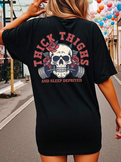INAWLY 大码女式字母与骷髅印花休闲落肩圆领 T 恤