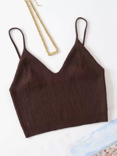 INAWLY 素色羅紋針織吊帶上衣 - 巧克力棕 - 查看 1