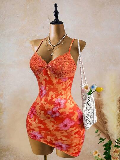 INAWLY 度假风花卉拼接印花不对称下摆修身迷你吊带裙 - 橘色 - 查看 1