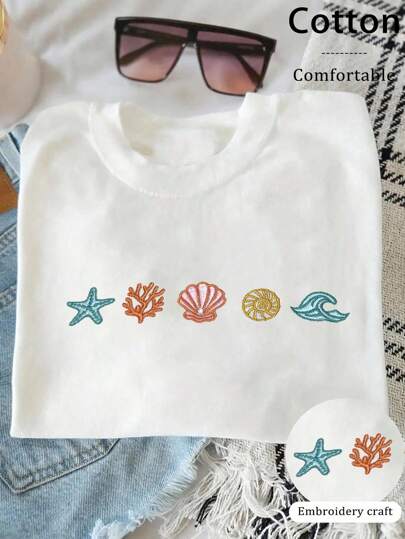 INAWLY 女士休闲海星与贝壳刺绣圆领短袖T恤,夏季