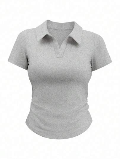 Airaco 女士纯色有领短袖休闲褶饰 T 恤 - 灰色 - 查看 1