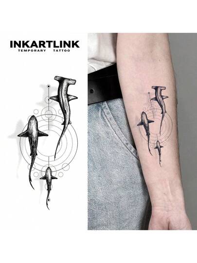 INKARTLINK 动感鲨鱼纹身贴纸,简约海洋几何波浪设计,临时纹身,防水持久 1-2 周 - 黑色 - 查看 6