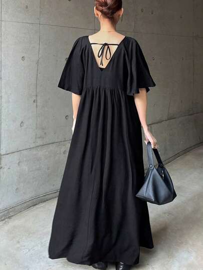 FRIFUL 女士黑色 A 字裙,优雅女士荷叶边袖休闲裙,夏季太阳裙 - 黑色 - 查看 1