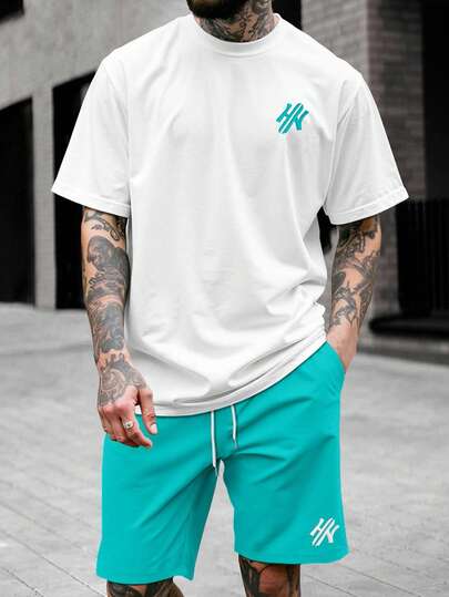 Manfinity Homme 男士字母印花圆领短袖休闲T恤+抽绳腰短裤两件套 男士两件套休闲短裤套装 男士休闲图形字母印花短袖T恤+短裤套装 - 彩色 - 查看 1