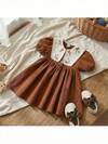 Loomiva 女婴复古灯芯绒柔软面料度假风撞色领腰部褶裥A字裙,翻领半开襟泡泡灯笼短袖