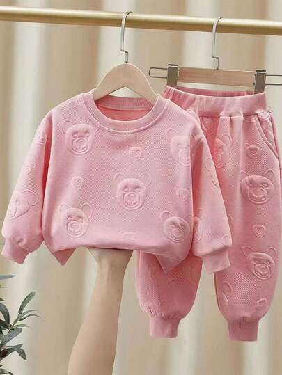 嬰兒女童休閒圓領長袖压花小熊衛衣和長褲套裝 - 粉色 - 查看 1