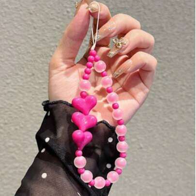 网红风粉色爱心纹理串珠手机挂绳链,甜美小众短款腕带,防丢串珠链,适合女生,可挂手机壳、钥匙链、相机等,网红必备 - 彩色 - 查看 1