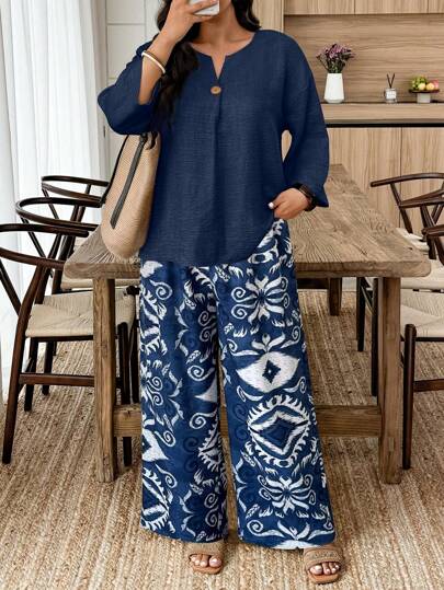 Weeklong 2件套大码女式休闲纯色长袖衬衫和花卉印花宽松裤套装 - 藏蓝色 - 查看 1