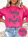 亮片刺绣“Merry & Bright”圣诞卫衣,亮粉色,适合秋冬季节的女士圣诞服装,大码落肩圆领休闲抓绒连帽衫