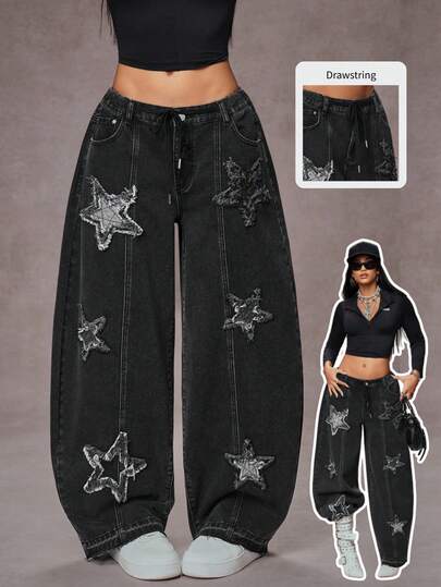Jeanoix Y2K 时尚休闲街头风星星刺绣毛边破洞牛仔裤 - 黑色 - 查看 1