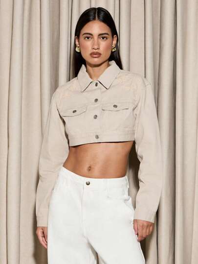 AiiRZ 刺绣短款卡车司机夹克花卉图案纽扣前襟春季时尚休闲外套过渡季街头潮流单品 - 卡其色 - 查看 2