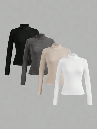 SHEIN 4 件 Tween 女童休闲纯色立领长袖修身 T 恤 - 彩色 - 查看 1