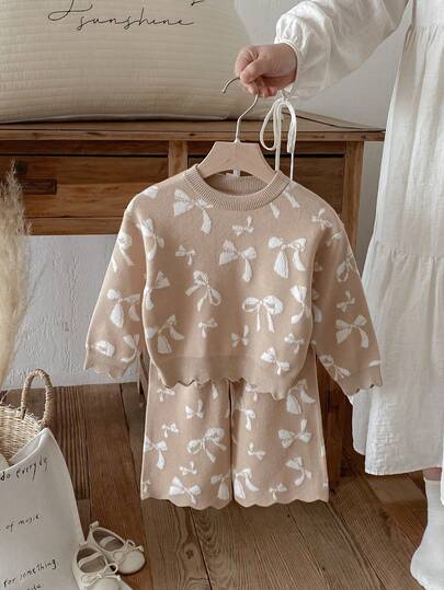 韩国INS风秋季女宝宝针织提花卫衣套装带蝴蝶结长裤两件套 - 杏色 - 查看 2