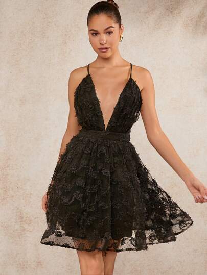 L'Amorae 深v領削肩蕾絲裙 - 黑色 - 查看 1