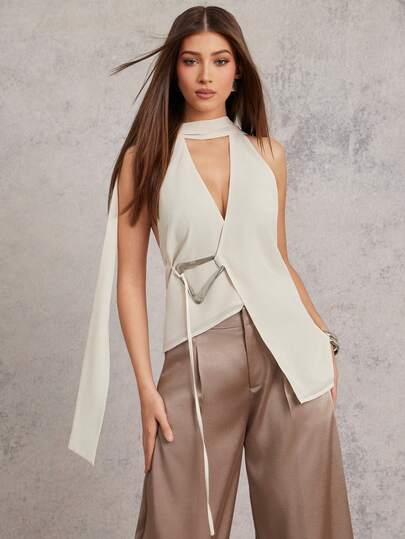 L'Amorae 女士雪纺银色饰扣边衬衫配围巾,商务休闲情人节约会外出 - 杏色 - 查看 2