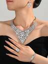 4 件套沙特阿拉伯铜质闪亮方晶锆石新娘首饰套装,中东迪拜项链、耳环、戒指、手链、婚礼配饰,情人节女士礼物