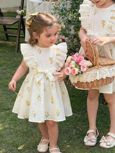 LMoss Kids 女宝宝夏季度假可爱碎花荷叶边无袖上衣和松紧腰裤套装 - 米色 - 查看 1