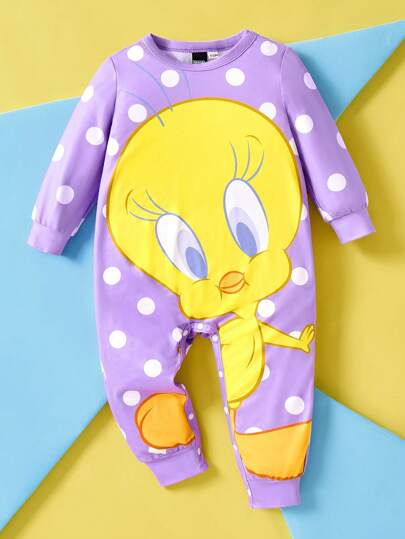 LOONEY TUNES X SHEIN 女婴可爱卡通波尔卡圆点和小鸟印花长袖连体裤,休闲甜美,适合所有季节 - 紫色 - 查看 1