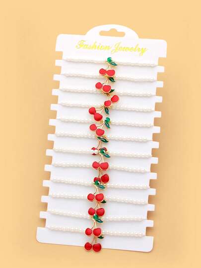 LORRILIA 12 件装可爱水果樱桃 Cheerios ABS 仿珍珠手链饰品幸运手链家庭共享装女孩礼物 - 彩色 - 查看 5