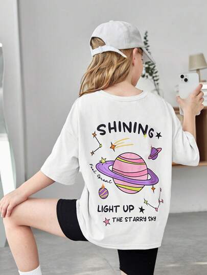 SHEIN 女孩標語和星球印花落肩T恤 - 白色 - 查看 1