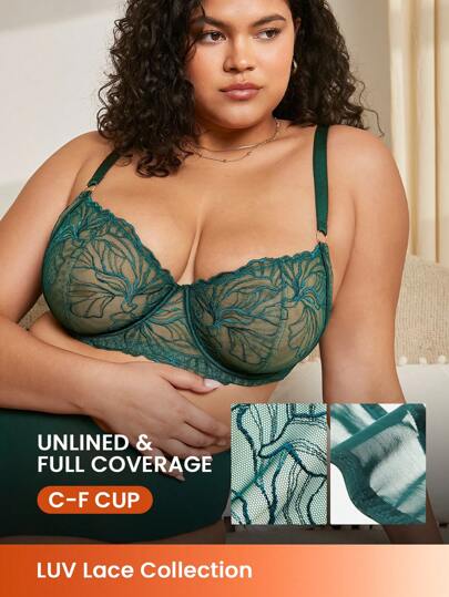 LUVLETTE 加无衬里全覆盖花卉蕾丝和网眼绿色缩小器网眼文胸内衣休闲曲线 - 綠色 - 查看 12