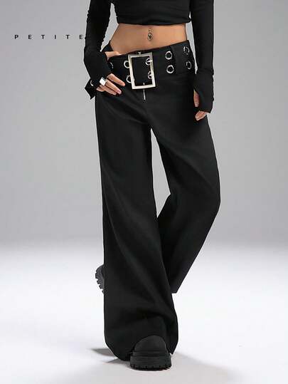 LYSMO Petite 女士金属扣眼腰休闲裤 - 黑色 - 查看 1