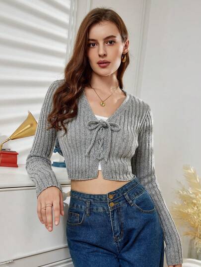 前繫帶短款開衫 - 灰色 - 查看 1