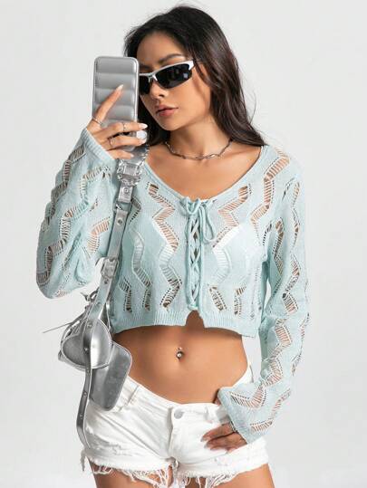 SHEIN Unity 前繫帶鏤空針織短款開衫不附胸罩 - 藍色 - 查看 1