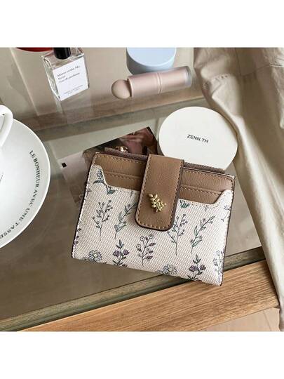 叶子图案金属纽扣零钱包简约时尚女士小号双折钱包迷你钱包零钱包小钱包可爱钱包 - 卡其色 - 查看 1