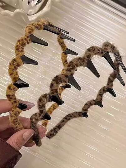豹纹毛绒波浪发带,优雅迷人,女士秋冬新款高顶骷髅头洗脸发夹气质额头断发整理发带,旅行摄影、派对聚会、日常佩戴、圣诞节、万圣节等各种节日均适用。 - 彩色 - 查看 1