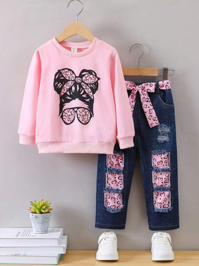 SHEIN 小女孩使命印花圓領運動衫和心型印花褲子 - 粉色 - 查看 1