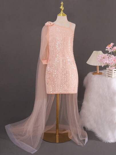 小女孩網紗亮片裝飾蝴蝶結連身裙,適合正式活動 - 粉色 - 查看 1
