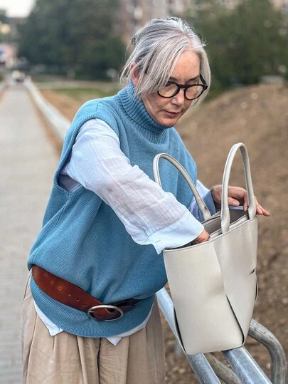 Livesso 女式无袖宽松高领针织背心 - 藍色 - 查看 6