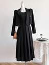 SHEIN Sweetra Young 少女通勤黑色针织拼布条纹荷叶边下摆长袖连衣裙,百搭春秋季