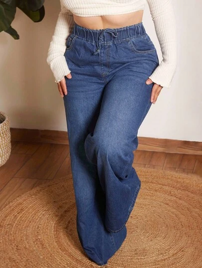 Lupita Cardoza 女牛仔裤休闲高腰阔腿裤蓝色女牛仔裤女夏装松紧腰牛仔裤牛仔裤休闲宽松直筒裤 - 深色水洗藍 - 查看 5